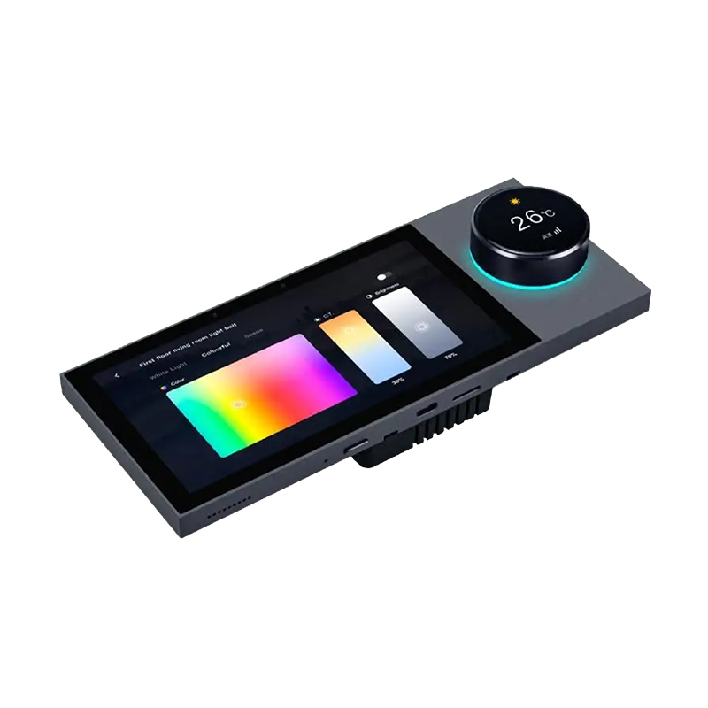 6inch LCD central control panel with gateway, voice, background music, device group control and device/scene sub-area control. With network interface, WIFI function, 2 relay output, Bluetooth transmission connection audio, 86*86*30mm. With knob function
