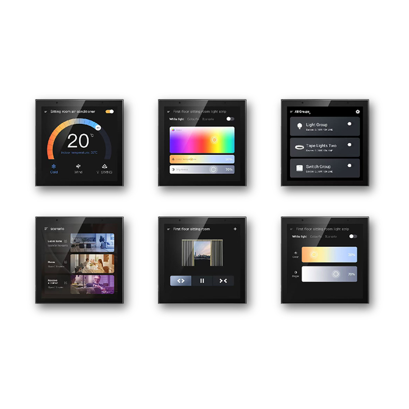 Fourinch LCD central control panel with gateway, voice, background music, device group control and device/scene sub-area control. With network interface, WIFI function, 2 audio interfaces, Bluetooth transmission connection audio, 86*86*30mm.