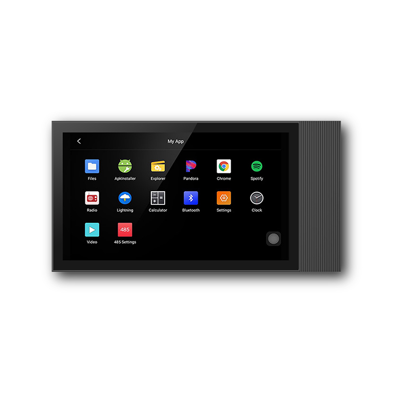7-inch LCD central control panel with gateway, voice, background music, device group control and device/scene sub-area control. With network interface, WIFI function, 2-channel speaker output, Bluetooth transmission and audio connection.